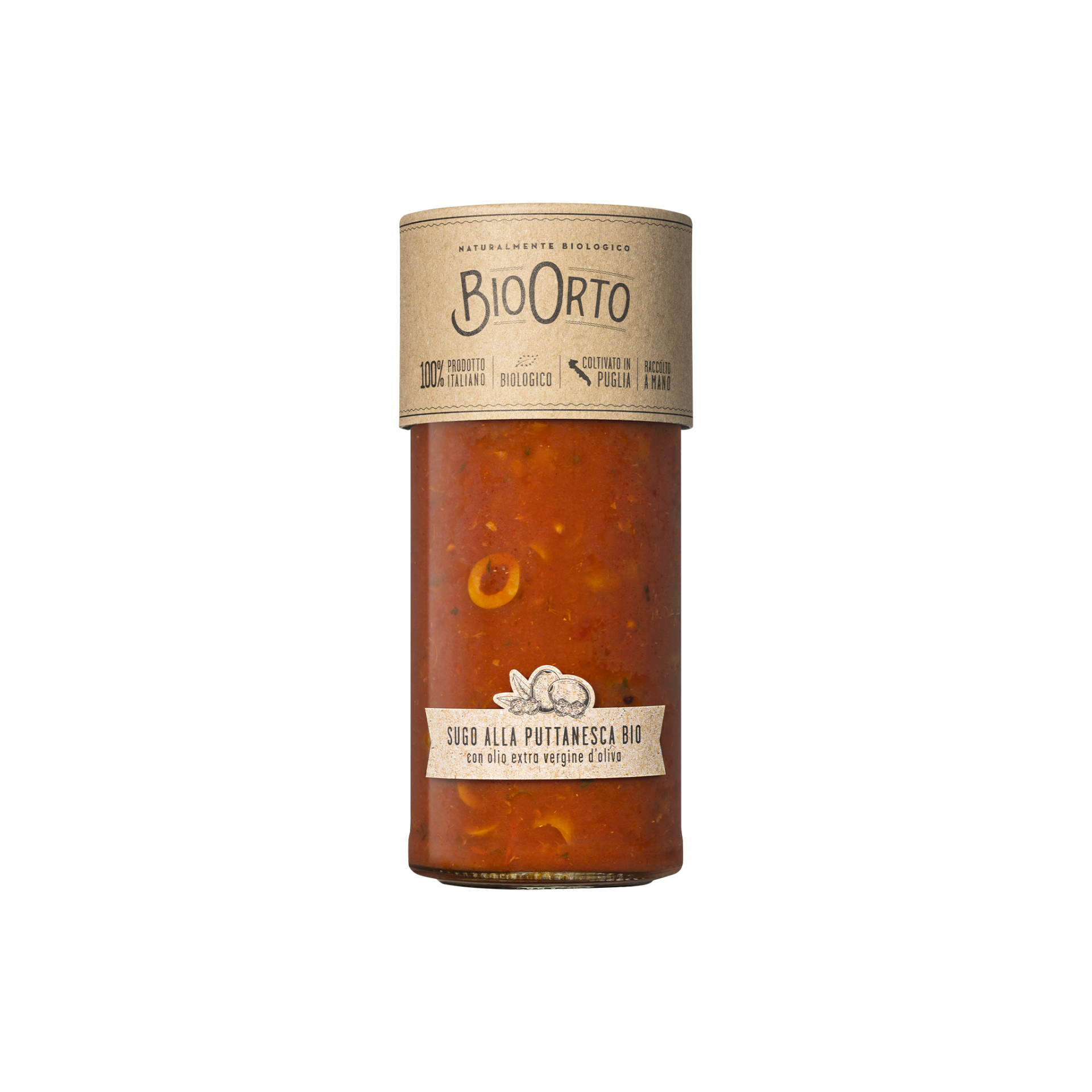La sauce aux légumes biologique Puttanesca, préparée selon la tradition italienne, combine des olives et des câpres avec de l'huile biologique EVO, créant ainsi un condiment au goût riche et unique composé uniquement d'ingrédients frais et biologiques. La sauce puttanesca de Bio Orto est un produit prêt à l'emploi, sans conservateurs ni sucre ajouté.